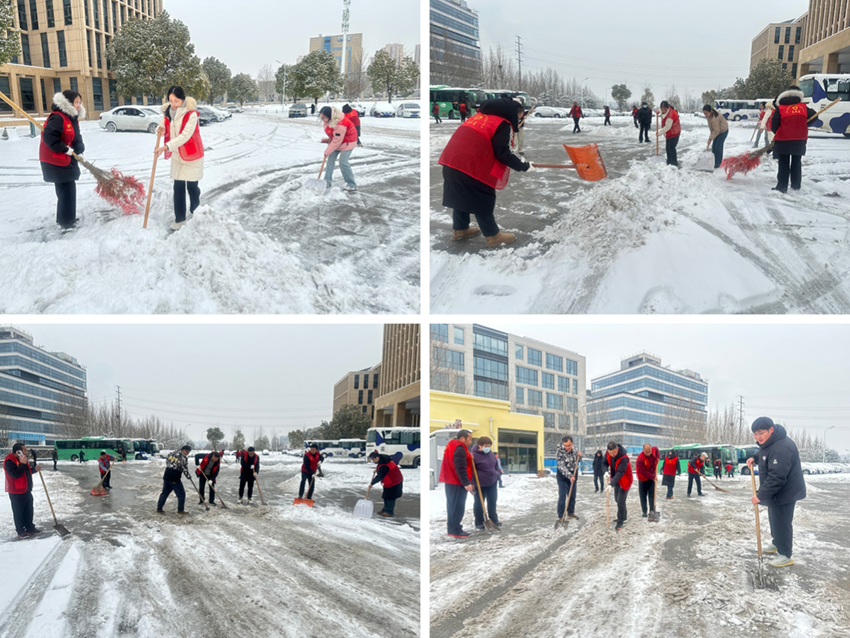 清晨寒風(fēng)刺骨,但現(xiàn)場(chǎng)干勁如火。大家身著醒目的紅色志愿馬甲,在皚皚白雪中迅速集結(jié),分成三個(gè)小組高效投入清雪作業(yè):一組負(fù)責(zé)集團(tuán)大樓正門前區(qū)域,他們揮動(dòng)鐵鍬,一鍬接一鍬奮力破除凍結(jié)的冰層;第二組沿主干道左側(cè)推進(jìn),他們手持掃帚與鏟子,細(xì)致清掃積雪、疏通通道;第三組則專注右側(cè)區(qū)域,他們默契配合,有人撒布融雪劑、有人鏟雪、有人及時(shí)掃雪,確保臺(tái)階和坡道防滑安全。沒(méi)有雪板,就用鐵鍬推、用掃帚攏;冰層太硬,就輪番上陣、接力攻堅(jiān)。盡管寒風(fēng)凜冽、鞋襪濕透、雙手凍得通紅,卻無(wú)一人退縮。鐵鍬撞擊地面的鏗鏘聲、掃帚劃過(guò)雪面的沙沙聲,匯聚成冬日里溫暖有力的奮進(jìn)旋律。